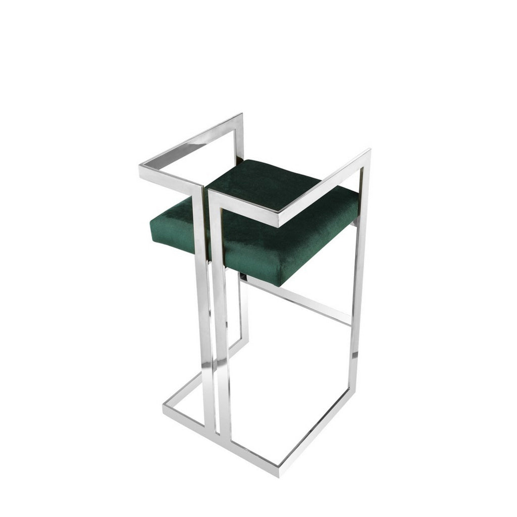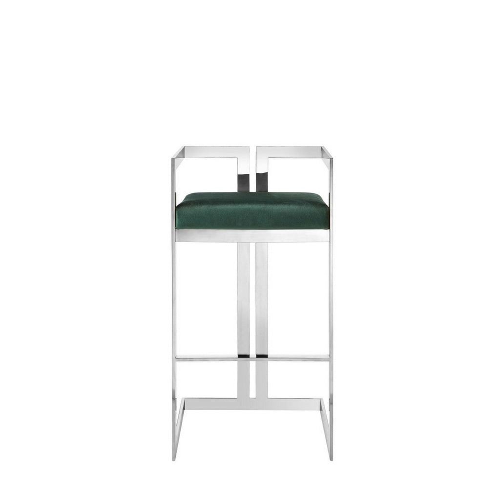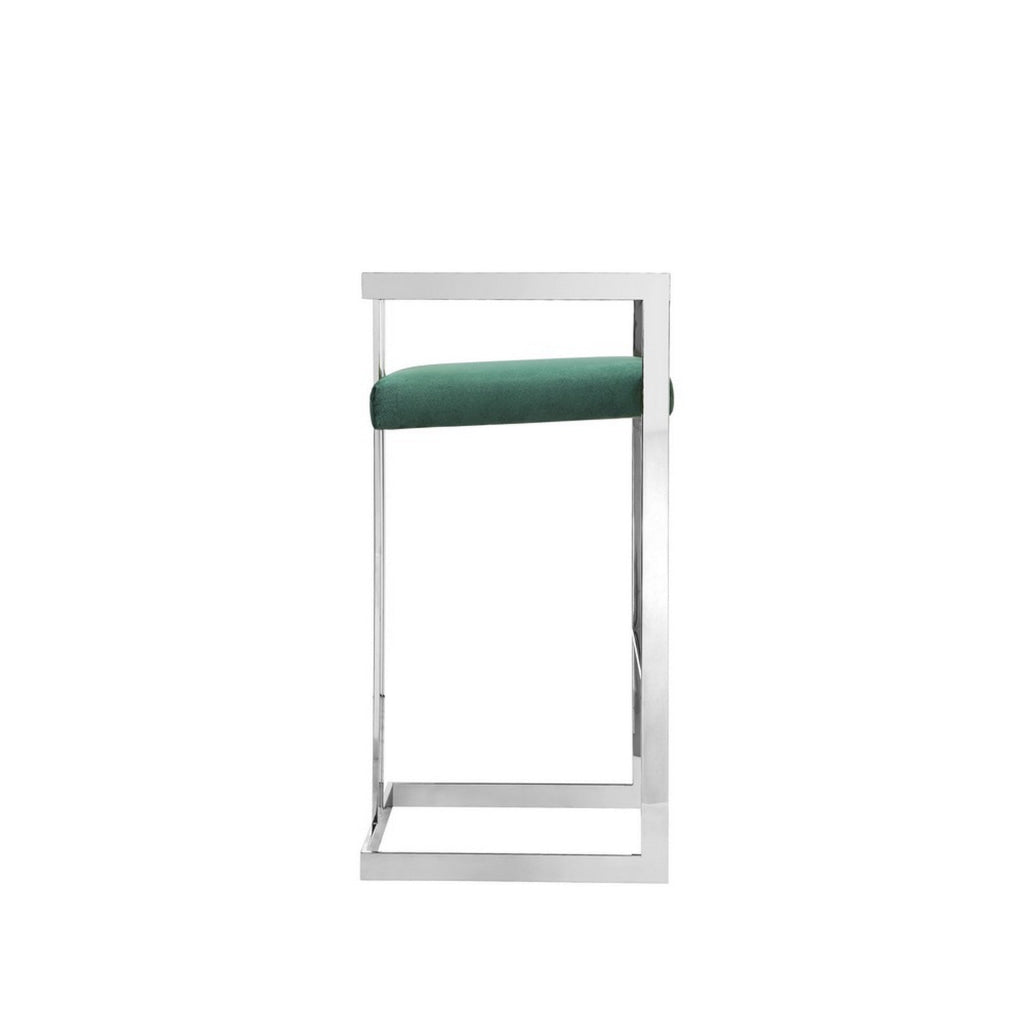 Clean lines and a modern design characterize this sleek barstool chair from our Suki collection. Made with silver finished stainless steel, it features a high density foam padded seat cushion and rich green velvet upholstery for superb comfort. Meanwhile, its low profile silhouette and stylish cantilever base offer comfort and elegance. Check out our Suki collection for matching options.