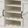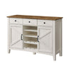 Embrace the rustic barn-style design of our white Syna storage buffet cabinet, seamlessly blending tradition with modernity. Its sturdy brown wood top provides a reliable surface for decorations. Adorned with two side door cabinets boasting sleek black metal handles, four-layer wine racks, and three drawers featuring round knobs, it has all the distinctive elements that define our Syna collection.
