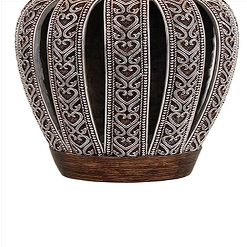 Description:Incorporating a white fabric drum shade, this table lamp makes a perfect addition to your decor collection. Ideal for any tabletop, it comes with a heart shaped carved paneled base complemented with decorative accents. This luxurious table lamp creates a dazzling effect in your home.