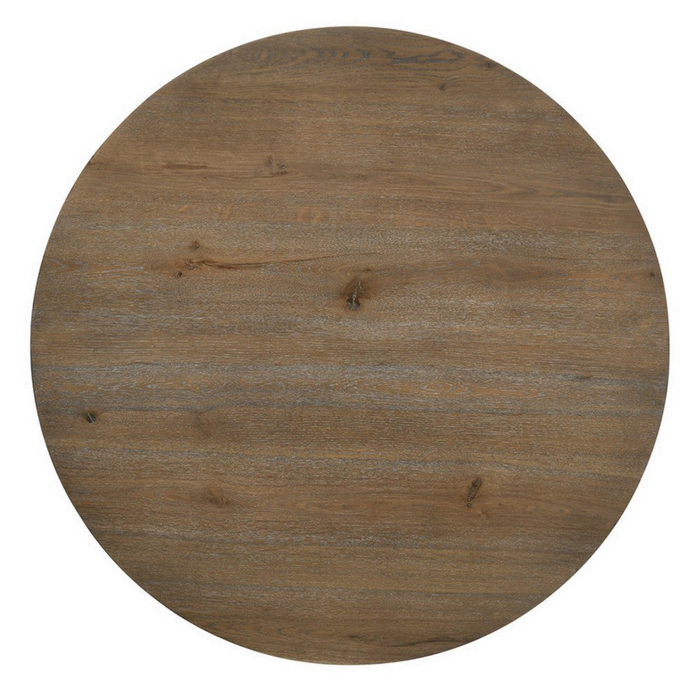 - Spacious round tabletop in a vintage walnut brown finish