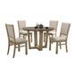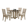 Description:Bring easy comfort to your dining room with our Tani five piece dining set. It includes one round dining table and four ergonomic dining chairs which have plush padded seats and back cushions, all wrapped in soft wheat beige fabric upholstery. The fusion of dual toned rustic finishes highlights the simplicity and charm of this set. Check out our Tani collection for matching set pieces.