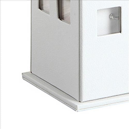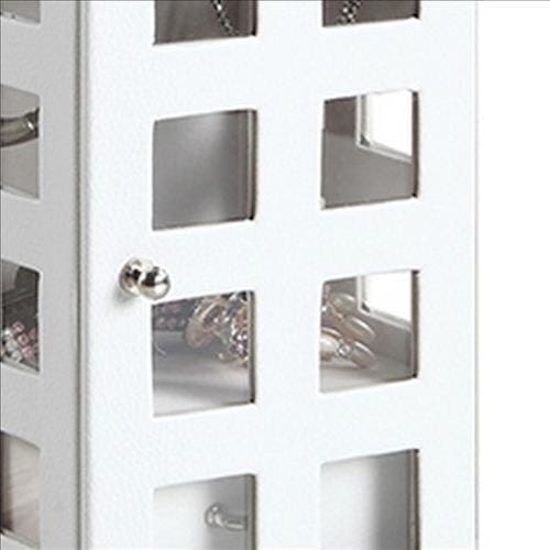 Description:Organize your jewelry collection in style with this unique and classic Telephone Booth Jewelry Box. Incorporating white leatherette with a clear glass windowpane panel, it comes with two drawers. The bottom drawer features a dedicated ring slot compartment, while each side panel comes with two wall mount jewelry hooks for display.