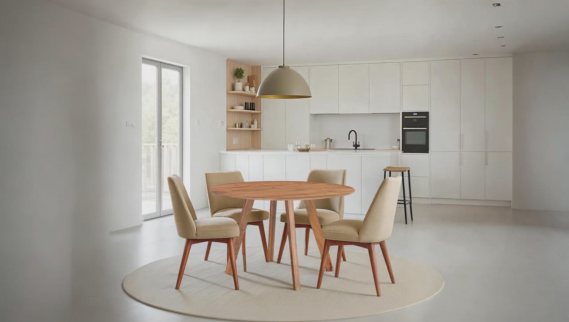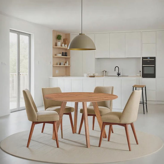 Redefine casual dining with this handcrafted round table, made from solid mango wood in a rich natural brown finish that highlights the organic grain. Sized to seat four, it’s perfect for intimate meals and relaxed gatherings. The clean, minimalist profile features a sleek round top and an angled four legged style base that brings mid-century flair and lasting support. Designed for both style and practicality, it includes discreet levelers for stability and a knock-down structure for easy transport and assembly. Explore more from our Temi collection to complete your dining space.