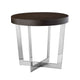 Our Tini side end table is a stunning accent, crafted from wood veneer in a luxurious espresso brown finish, radiating warmth and sophistication. Its round top showcases exquisite wood grain details, adding depth and character. This rests atop cross-framed legs in high-polished steel for a touch of modern elegance and industrial flair. Check out our Tini collection for more color options.