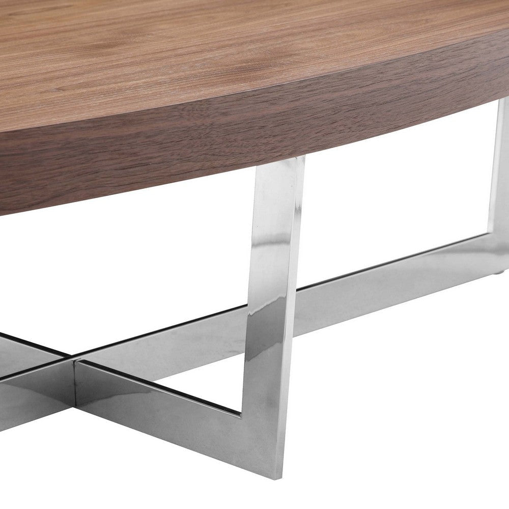 Tini 55 Inch Coffee Table, Oval Top, Chrome Frame, Walnut Brown Finish By Casagear Home