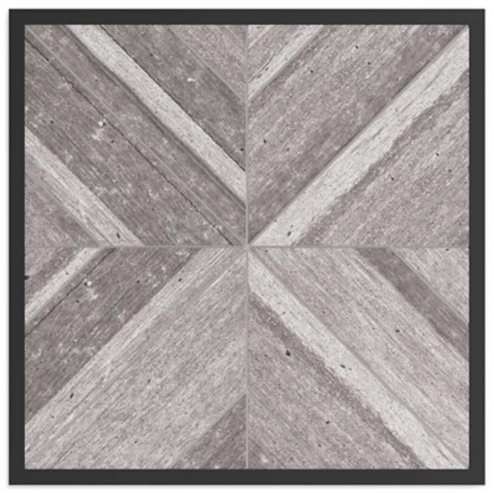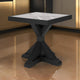 - Reverse diamond tile patterned thick porcelain tabletop in a light gray finish