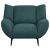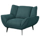 Introducing our Toer wide accent sofa chair, a statement piece designed for comfort and style. Featuring soft teal blue upholstery and black metal legs, it adds sophistication to any space. With flared arms and generous seating space, it is perfect for lounging or family entertainment activities alike. Check out our Toer collection for more matching set pieces.