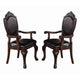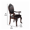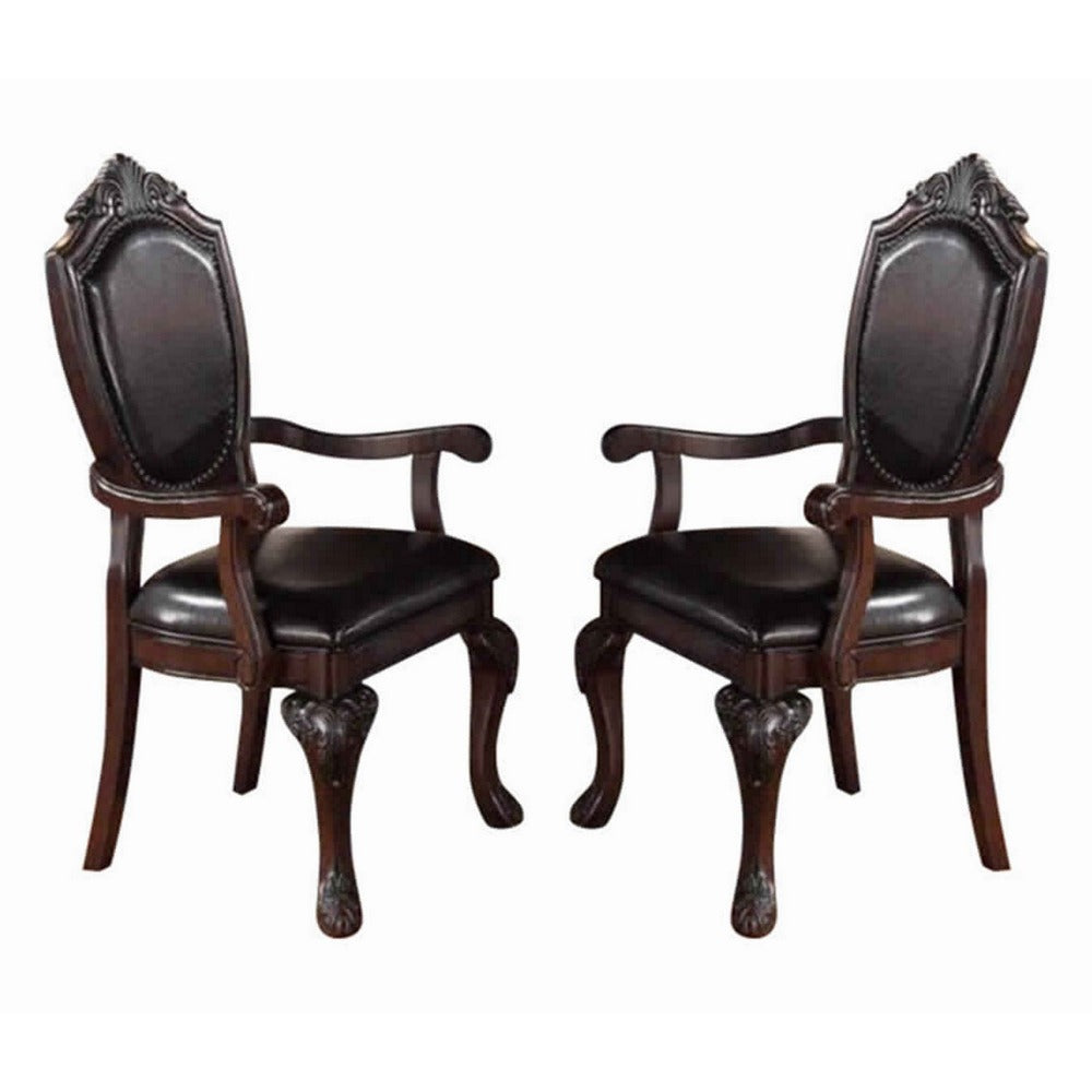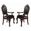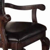 Add some royal style to your dining room area with this set of 2 arm chairs with carved floral accents. These dining chairs feature a rubber wood frame in espresso(brown)finish with astounding carved floral accents. The backrest and seat is upholstered in espresso faux leather and features a studding trim on the back rest. Dimension: 26" X 24" X 43"H (Primary Color: Brown)