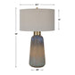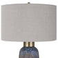 A Beautiful Display Of Color And Style, This Ceramic Table Lamp Features An Embossed Design With A Unique Mix Of Matte And Gloss Glazes In Various Shades Of Blue-green, Indigo, And Golden Rust, Paired With Antique Brass Plated Details. The Hardback Drum Shade Is Covered In A Light Gray Linen Fabric With Natural Slubbing.