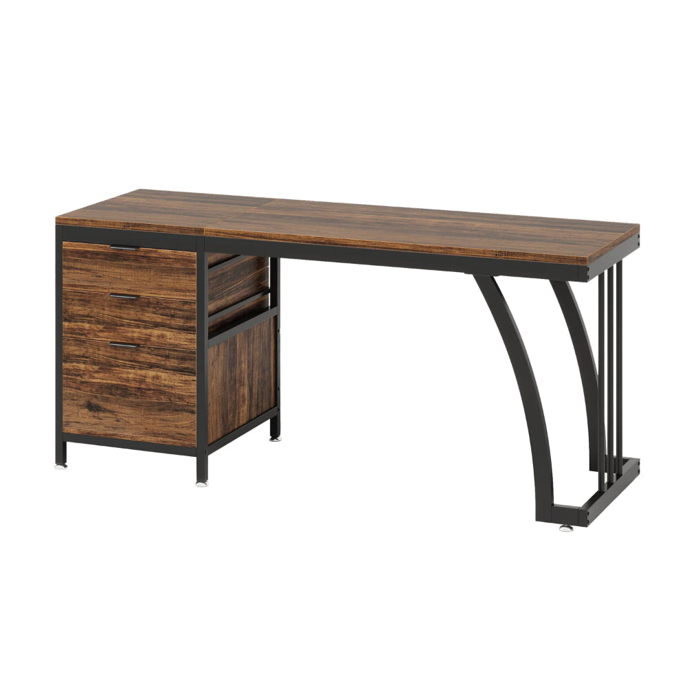 Vanity Desk Table, 3 Drawers, Rustic Brown, Black Metal Frame, 59 Inch
