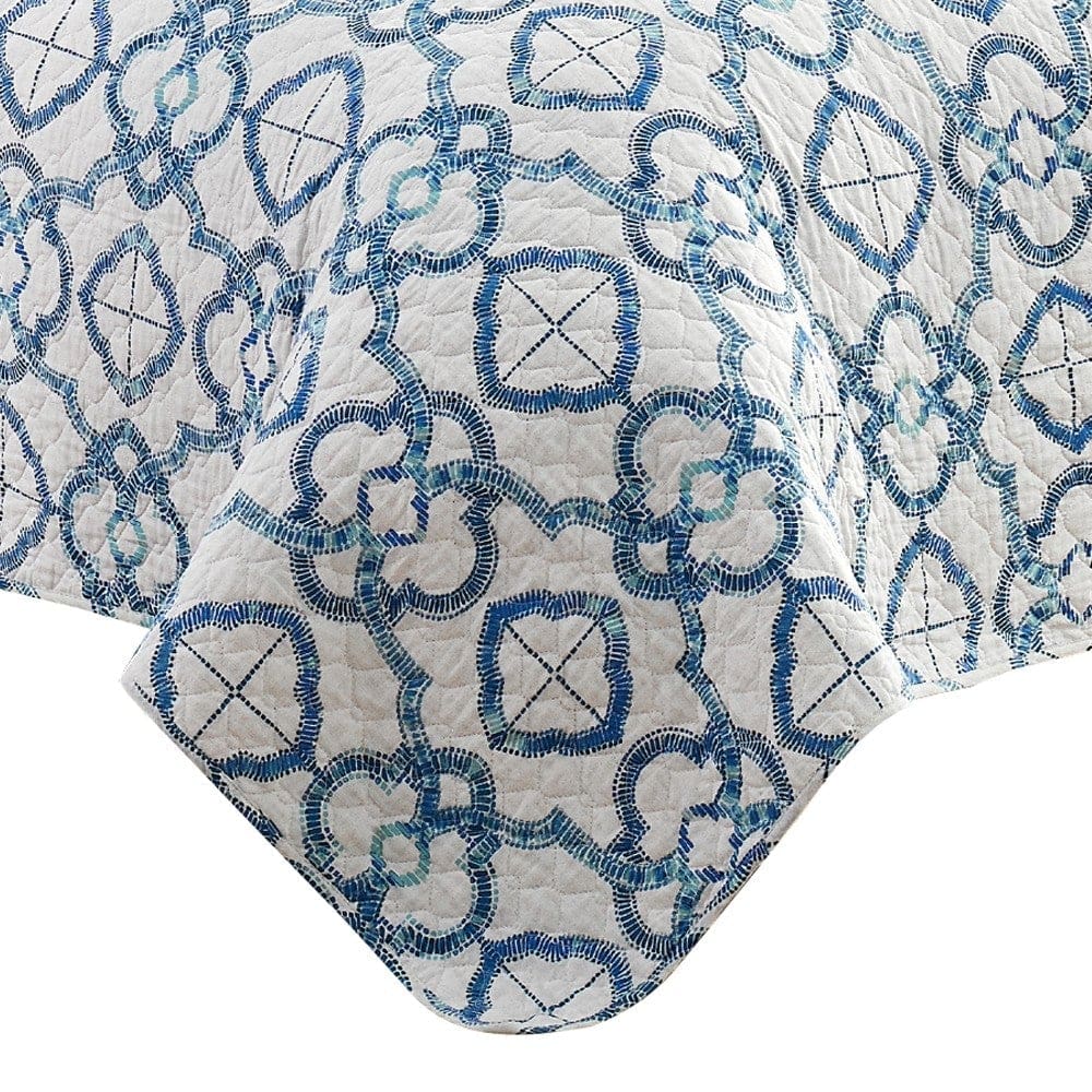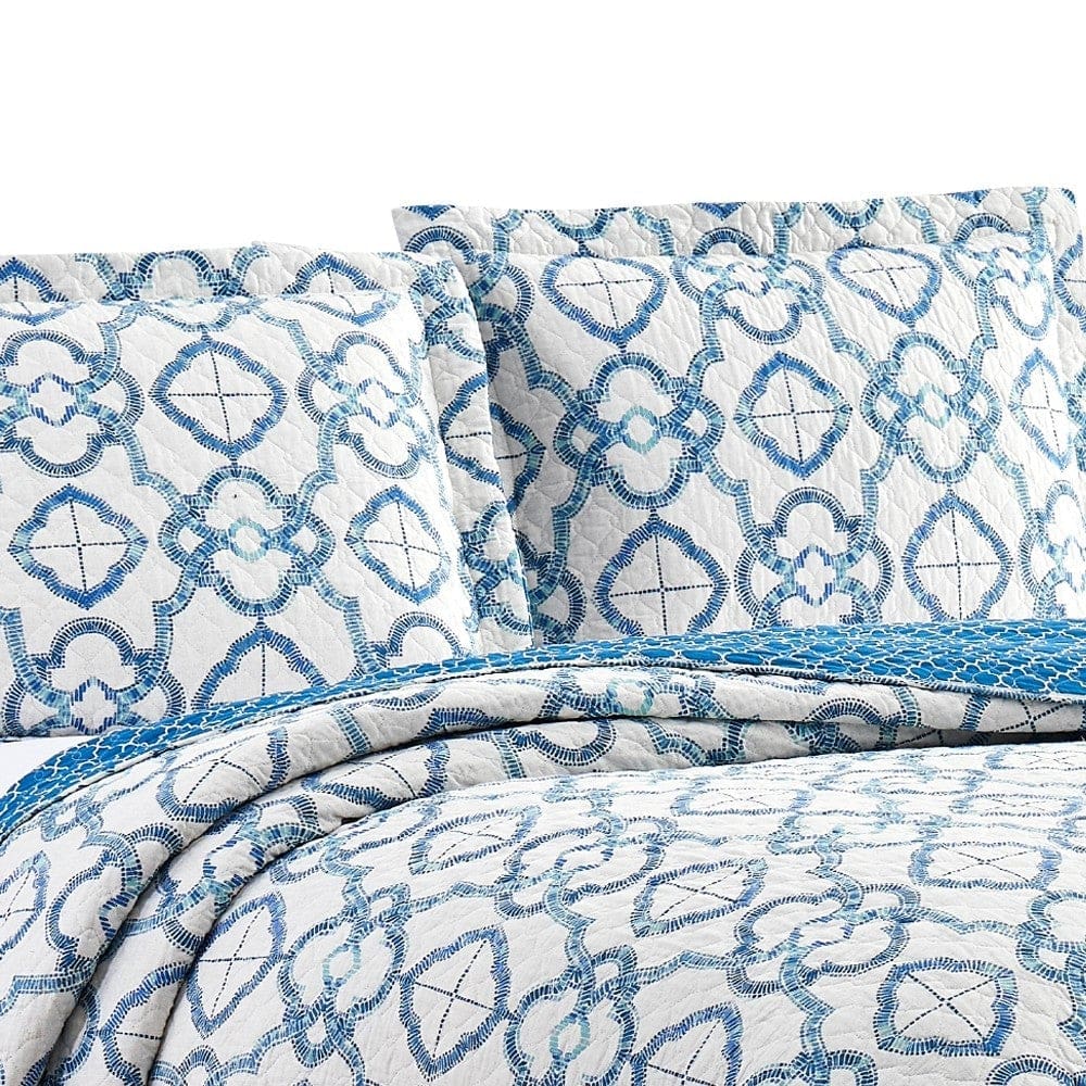 Comfort meets modern technology with this 3 piece queen Quilt set, which undergoes an enzyme reaction after being washed to make the fabric ultra soft. Crafted from the soft cotton fabric, it showcases beautiful mosaic embroidery in the hues of blue and white.