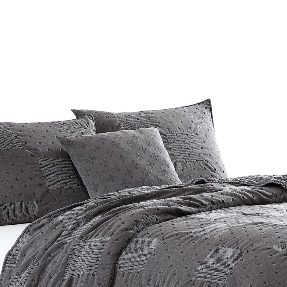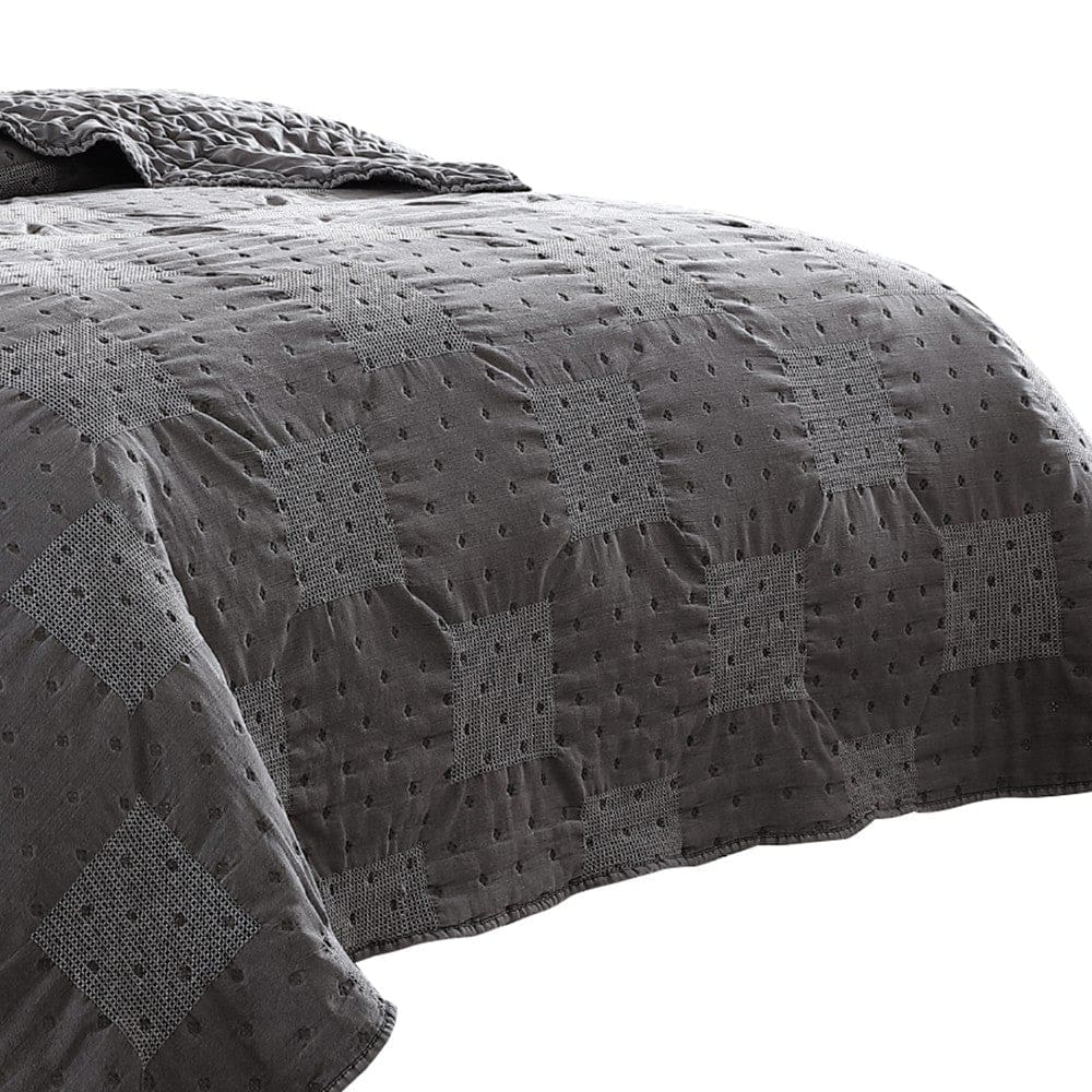 Give a quick makeover to your bedroom with the introduction of this 4 piece queen Quilt set, which comprises 1 Quilt, 2 pillow shams and 1 decorative pillow. Crafted completely from soft microfiber, it showcases exquisite polka dots and subtle patchwork in the hue of charcoal gray.