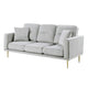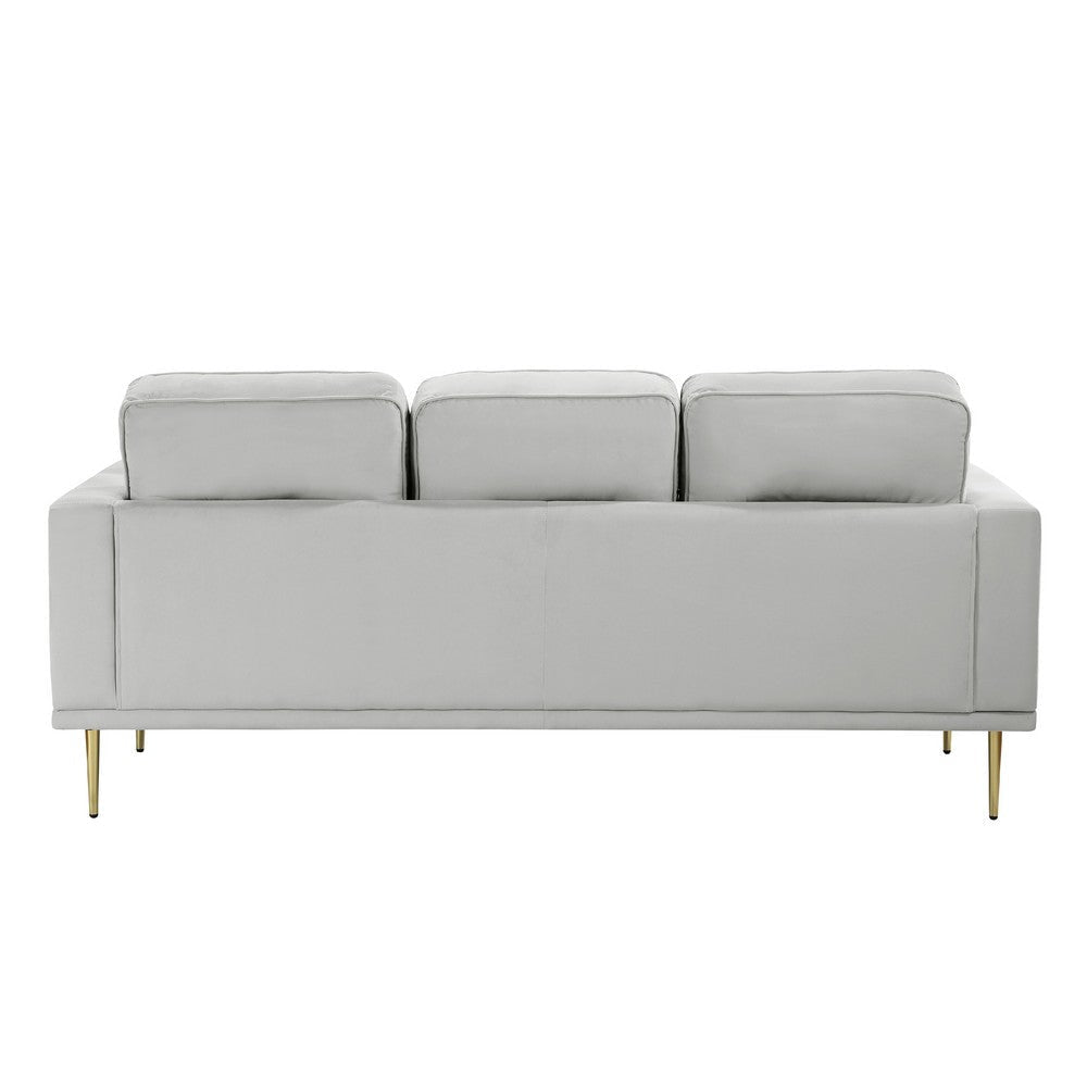 Introduce a refined and bold character to your space with this striking sofa, designed to captivate and comfort. Constructed with a solid wood and plywood frame, it features luxurious gray velvet upholstery and sleek gold metal legs for a refined finish. Reversible cushions with removable covers ensure long-lasting function. Explore our Voxo collection by Casagear Home.