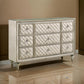 Enhance your space with the luxurious charm of this wide dresser chest. Wrapped in beige velvet, it features geometric shapes on the upholstery, quilted drawer fronts, and crystal-like knobs that add glamour. Crafted from wood, it offers ample storage with nine spacious drawers, making it a functional and stylish addition to your bedroom. Check out our Willa collection for more options.