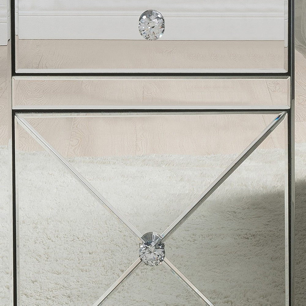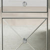This Contemporary Nightstand is a dazzling statement piece for you to display anywhere in your home. This chic, sophisticated piece boasts a durable wooden construction in a sleek, silver finish with fully mirrored surface. The two drawers of this nightstand provide you space to store books, magazines and remotes out of sight, while its spacious top provides you space to display photo frames, vase or lamp. Completed with crystal inserts and faux crystal knobs, this nightstand will provide a glam look to your bedroom. Note: Other featured items in image except this nightstand are sold separately.