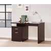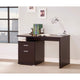 Clean straight lines plus the storage of a built-in cabinet pedestal make this desk stylish and functional. The cabinet includes two shelves and one large bottom drawer. The contemporary desk is reversible so that the cabinet pedestal can be configured on the left or right of the desk to best accommodate your home office work space; featuring a rich cappuccino(brown) finish.