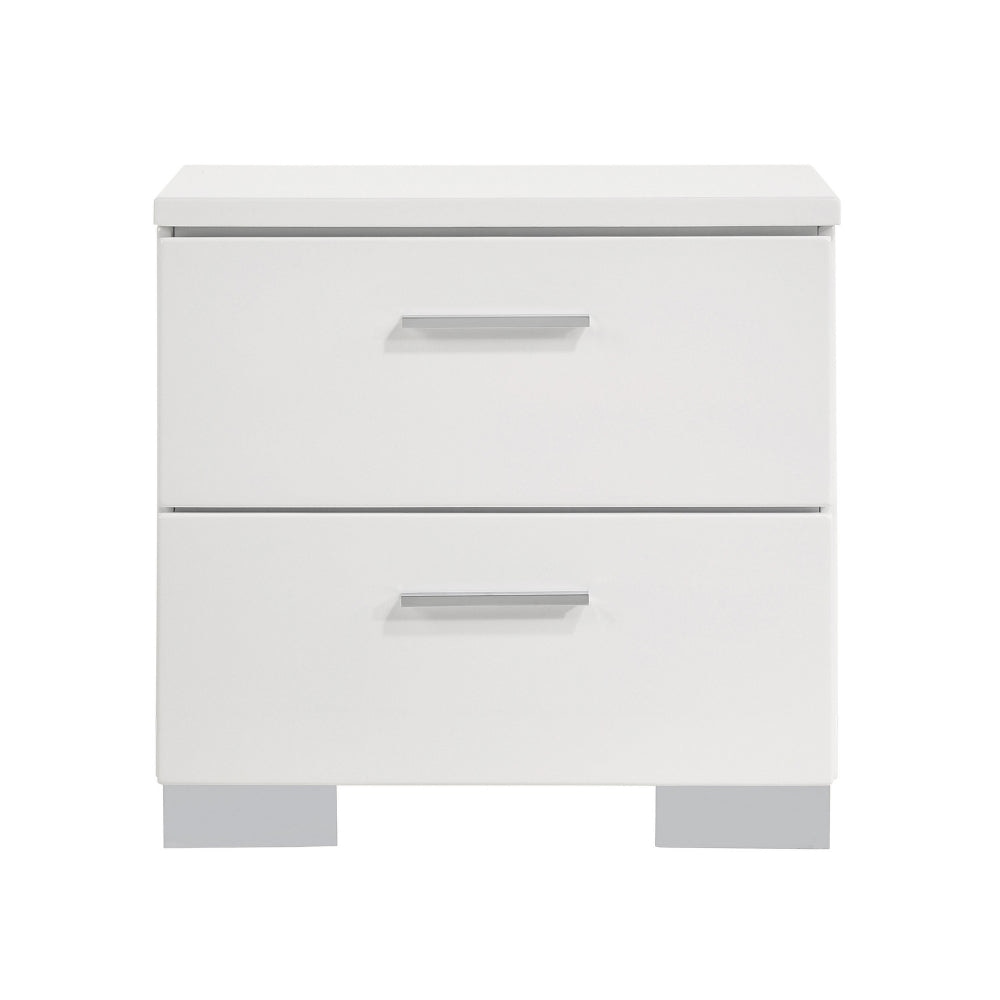 Sleek and classy, this nightstand will modernly accompany your bed and make a striking punctuation. Made up of wood, the nightstand features two drawers to hold all your bedtime essentials efficiently. It comes in a white finish and displays polished chrome metal handles of the drawers and bracket feet.