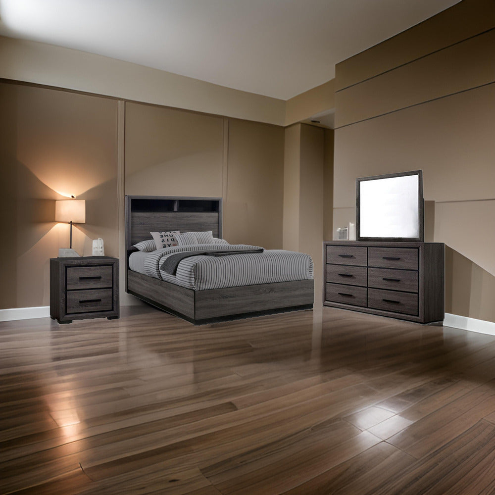 This elegant 4 piece bedroom set exudes modern sophistication with its rich gray wood finish and clean lines. The centrepiece is a king-sized bed featuring a built-in headboard shelf, ideal for books or decorative items. A six-drawer dresser with a large mirror complements the set, providing ample storage and enhancing the room's spacious feel. A two-drawer nightstand add functionality and style. Minimalistic metallic handles and neutral gray tones blend seamlessly with contemporary or minimalist interiors, while the natural light and open layout create a warm, inviting ambiance.